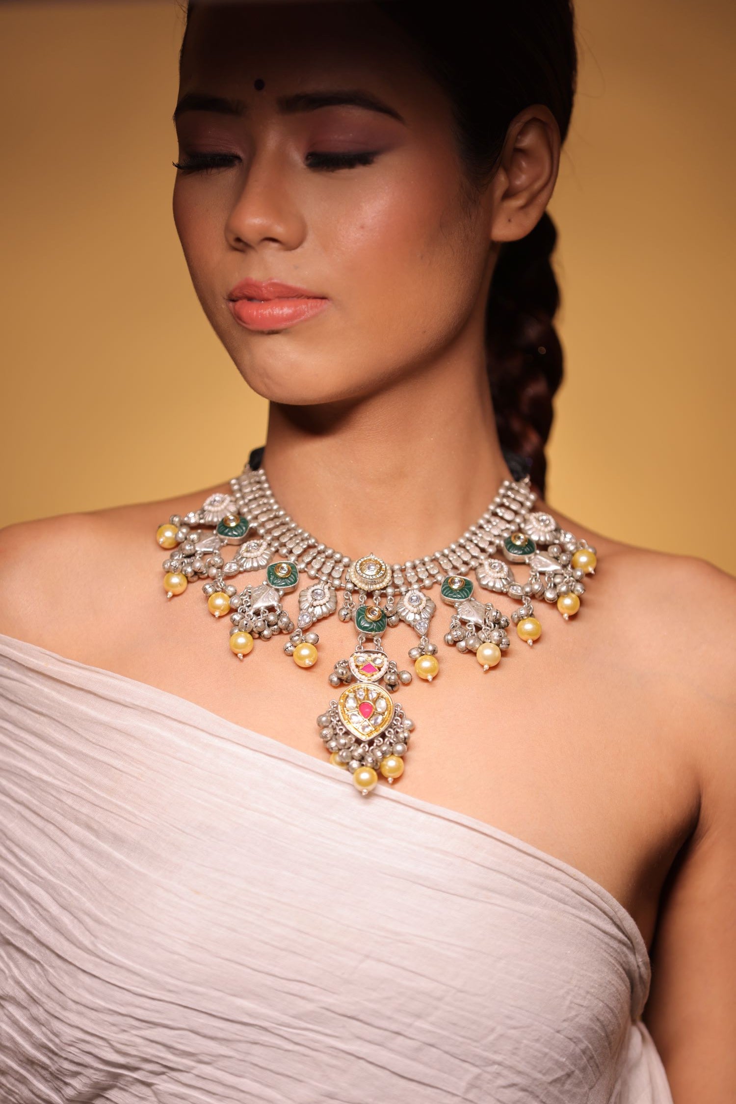 We present our handcrafted and finely curated "Tribal Maharani" which signifies the emotion of cheerfulness at the sight of remarkable jewels. This collection is embellished to being unusual , striking and extraordinary to elevate your look.